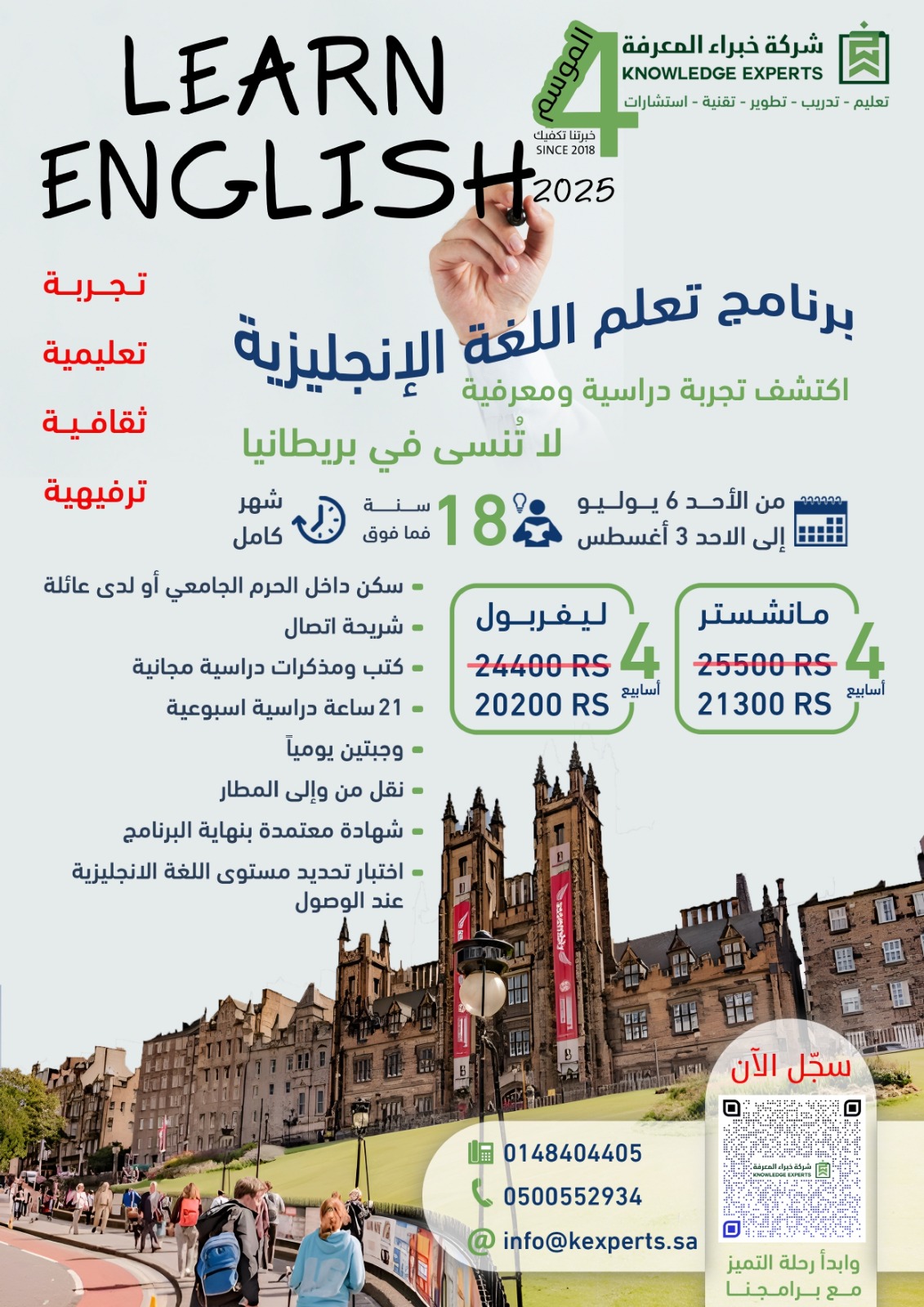 مرحبًا بك في رحلتك لتعلم اللغة الإنجليزية في بريطانيا! هنا، ستتاح لك الفرصة للانغماس في بيئة ناطقة بالإنجليزية، مما يساعدك على تطوير مهاراتك اللغوية بسرعة وثقة. سواء كنت ترغب في تحسين محادثتك اليومية، أو تعزيز فرصك الأكاديمية والمهنية، فإن تجربة التعلم في بريطانيا ستمنحك المعرفة والثقافة في آنٍ واحد. انضم إلينا واستمتع برحلة تعليمية ملهمة تجمع بين التعلّم والمغامرة!